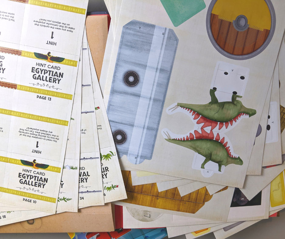 You’ll encounter terrifying dinosaurs, spooky Ancient Egyptians, vicious Vikings, amazing animals, fearsome knights, and even explore space as you find your way out of a series of mysterious museum galleries using the press-out pieces.