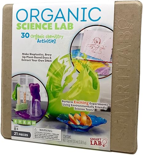 Organic Science Lab (Ages 8 and up) – 30 hands-on organic science experiments and crafts: Following the activity book’s step-by-step instructions, make your own earth-friendly slime, glue, bioplastics, paints and dyes, paper, and even candy wrappers while learning about transpiration, photosynthesis, greenhouse gases, polymers, DNA, acid-base reactions, the problems with petroleum-based plastics, and more