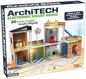 This cool construction kit lets you design houses with lights, sensors, sounds, and moving parts. With a combination of construction pieces and electronic circuitry components, Archi-TECH Electronic Smart House teaches creative engineering and technology in a whole new way.
