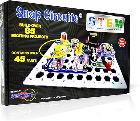 Snap Circuits Electronics Discovery Kit (ages 8 and up) – COMPLETE over 85 thought provoking projects exploring electricity, electronics and magnetism with 45+ Snap Modules. INCLUDES meter, electromagnet, motor, lamps, switches, fan, compass, and electrodes. No tools or soldering required. The components snap into place. My sons used to love these!